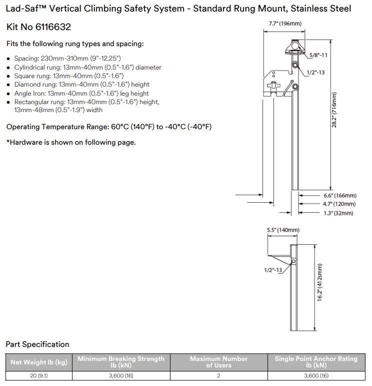 This 2-user, stainless steel vertical safety system (vertical lifeline) meets the new ANSI Z359.16 standard, along with OSHA 1910.140 and 1926.502, when used with the Lad-Saf X3 Detachable Cable Sleeve (6160054) and Lad-Saf X2 Detachable Cable Sleeve (6160030) and is ideal for fixed ladders.