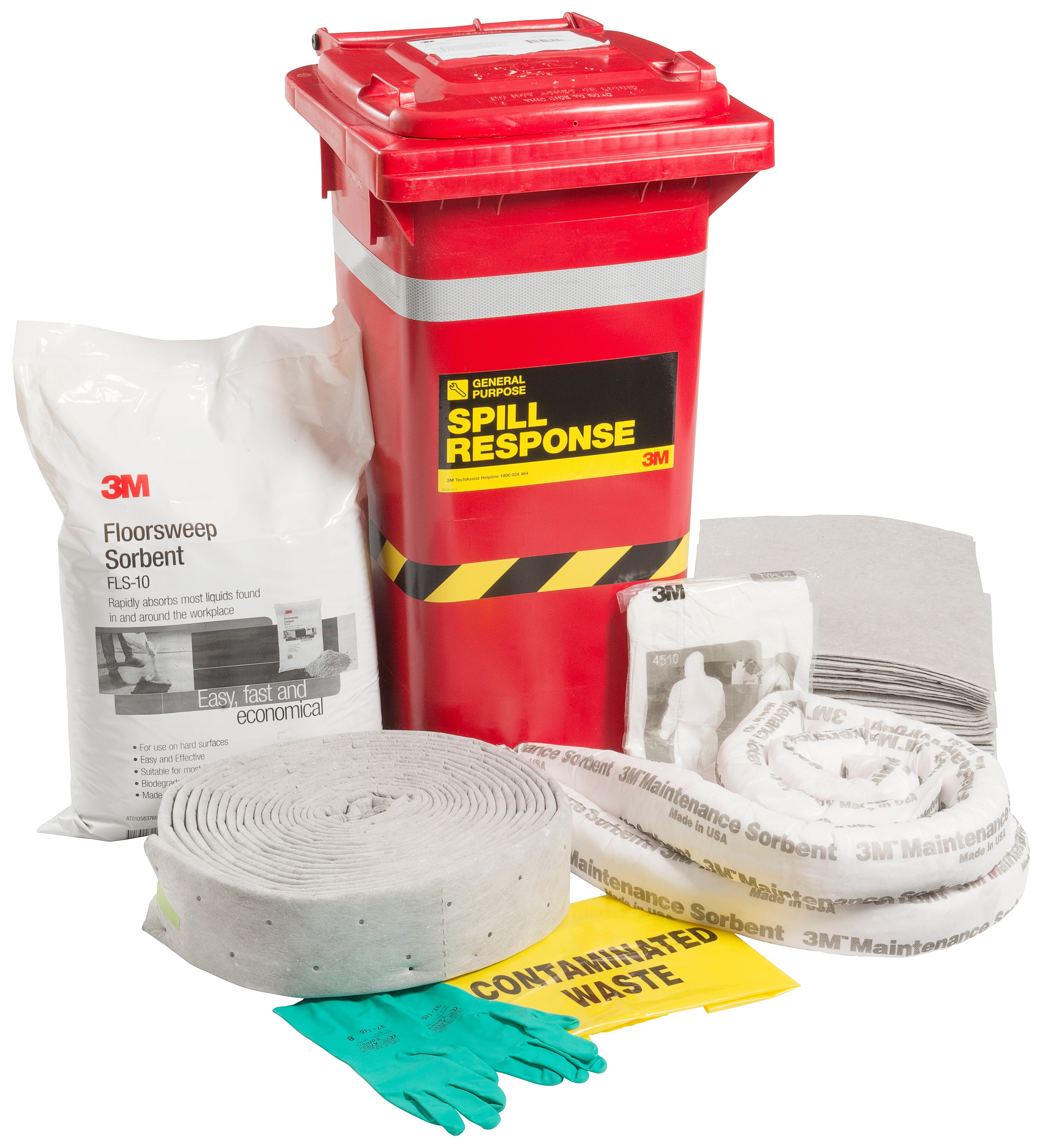 Kit Contains: 25x 3M General Purpose Sorbent Pad, 2x 3M General Purpose Sorbent Boom, 1x 3M General Purpose Folded Sorbent, 1x 3M Floorsweep, 1x 3M 4510 Disposable Coveralls XL, 1x 120L Wheelie Bin, 1x Pair of Solvent, and Oil Resistant Gloves, 1x Contaminated Waste Bag, 1x Spill Response Procedures, 5x Tamper Seals