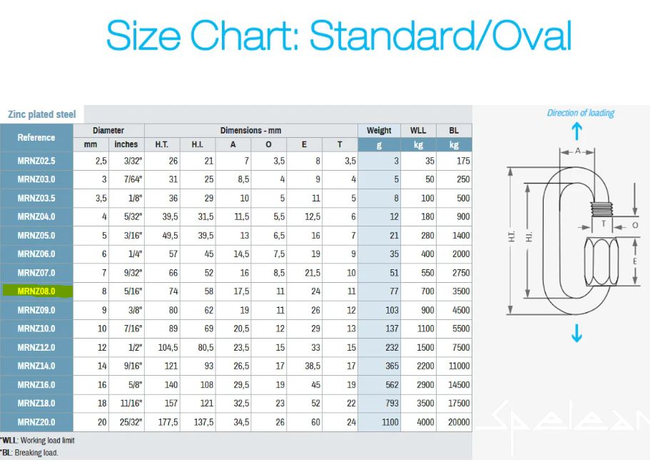 The original, NORMAL (OVAL) shaped MAILLON. Was developed on the priciple of a chain link fitted with manual nut opening. This shape reflects the spirit of MAILLON rapide quick link connectors. Finger tighten for a semi-permenant connection or spanner tighten for a permenant connection. Specifications• Material: Zinc plated steel• Diametre: 12 mm• Height: 104.5 mm• Opening: 15 mm• Weight: 77g• WLL: 700kg• Break Load: 3500kg