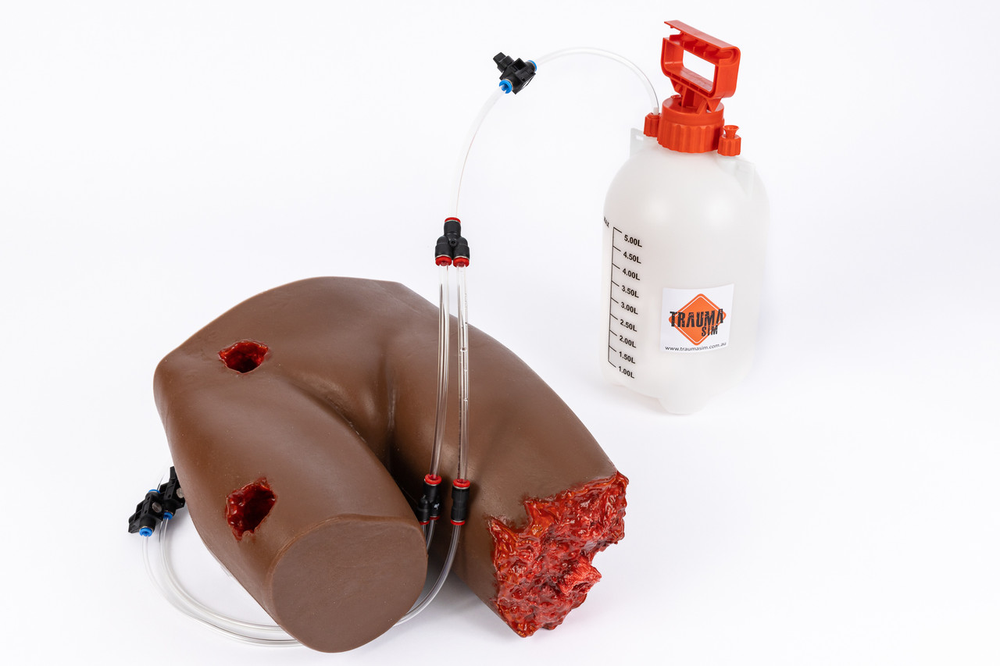 The Haemorrhage Control Simulator is a realistic robust training aid for teaching and practising the most critical and difficult of external haemorrhages - junctional wounds. This training aid with 3 separate wounds - groin wound (junctional) outer thigh wound & mid-thigh amputation - allows trainees to use a junctional tourniquet a standard limb tourniquet and haemostatic dressings all in one unit. The fleshy wound end can also be used for the stump dressing technique. The simulated pelvis connects to a pump and simulated blood flows from the wounds; taps control the 3 injuries separately. Set consists of: Includes: Simulated pelvis & thigh All tubing and fittings Silicone skin & urethane bone 5-litre manual pressure pump Rugged construction for field use Packed in rigid plastic trunk Please note connection colours may vary depending on stock availability.