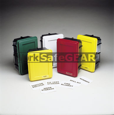 Made from corrosion resistant ABS with UV inhibitors Rubber door seal protects against dust and moisture Non-metallic hinges and latches prevent rust Comes with 17 various labels for customisation PPE, MSDS’, Spill Kit, First Aid, Instruments ,Fire Blanket ,Visitor Specs ,Safety Glasses, Lockout/Tagout, Hand Protection, Fire Extinguisher, Hearing Protection, BioSafety Products, Safety Documents, Respirator Storage, Disposable Respirators, Maintenance Supplies, Respirator Fit Test Equipment
