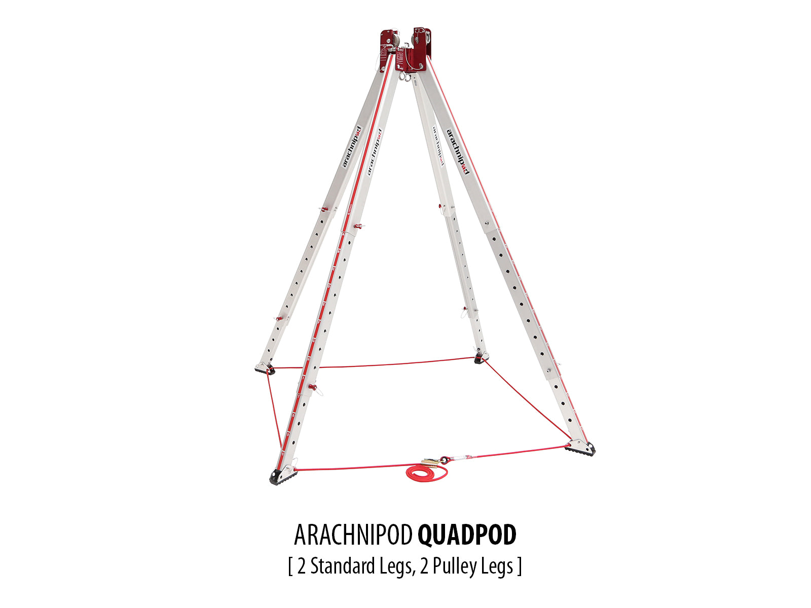 The Arachnipod Quadpod comprises two Standard Legs and two Pulley Legs. The system provides two load attachment points, four stabilisation rigging points, two double-grooved pulleys plus the versatility to configure additional technical systems. The Arachnipod's uniquely designed head system enables legs to be quickly disconnected from each other to store flat for compact storage and transportation. Each of the legs is supplied with an upgraded Standard Foot 2.