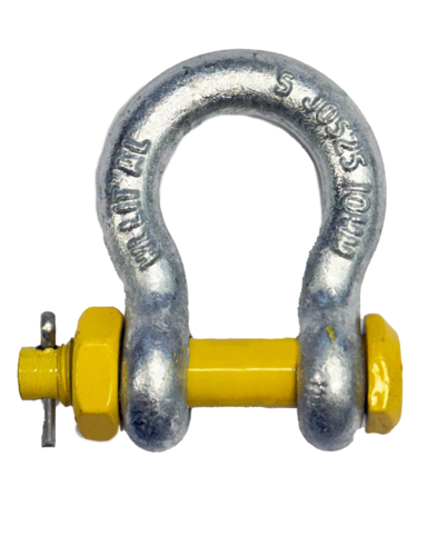• Conforms to AS2741 manufactured from Grade S material in bow configuration with safety pin hot dipped galvanised. • Marked with working load limit in tonnes, quality grade, batch numbered, nominal size in millimetre and supplier identification. • Proof tested to 2 x working load limit, with a minimum break force of 6 x working load limit. • Test certificates are available upon request. Also available in black color in all sizes upon request. • Suitable for lifting applications.