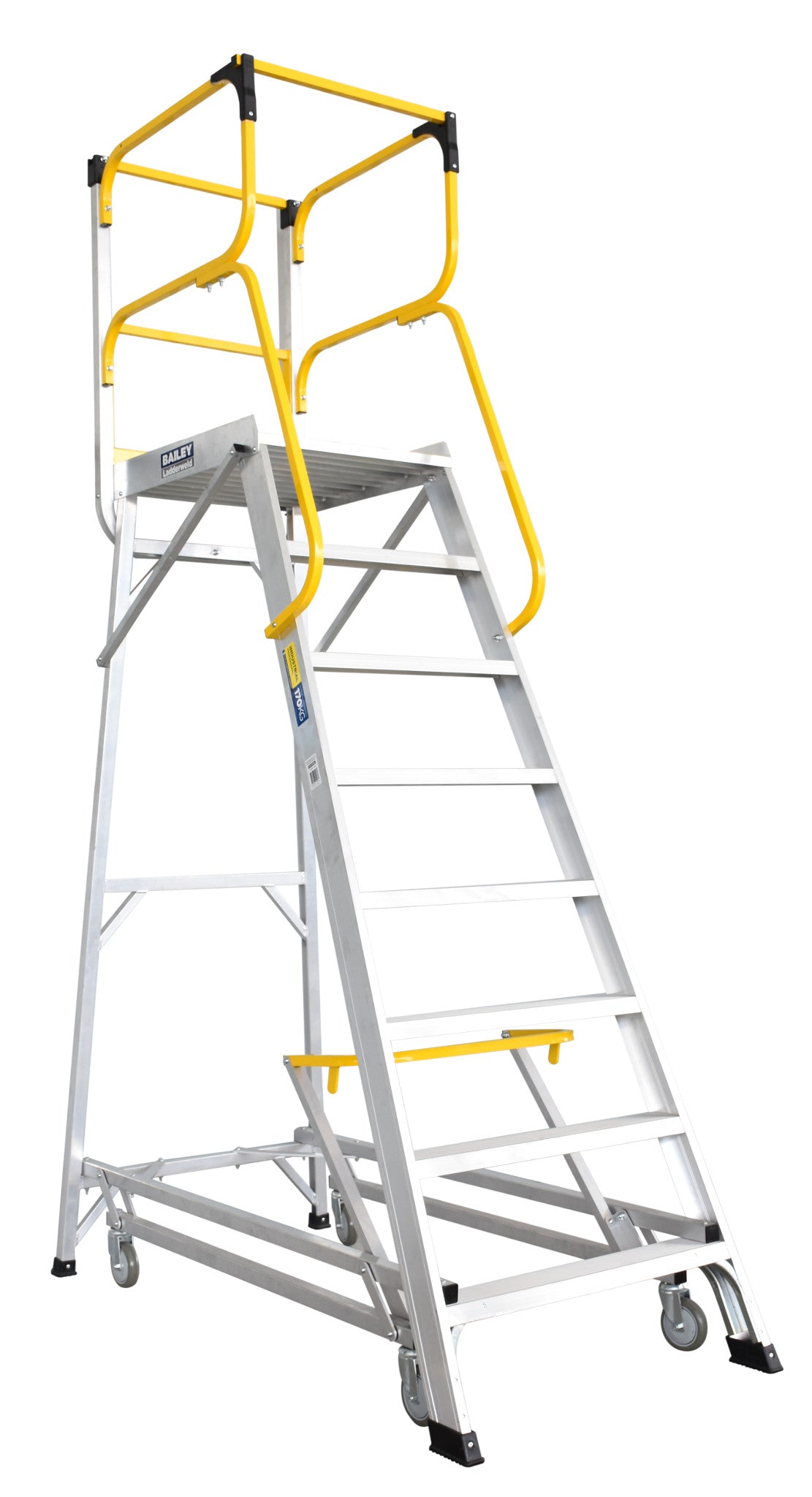 The Bailey FS13596 LADDERWELD access platform is an industrial-duty aluminium platform ladder designed for safe, efficient access and stock picking in warehouses, transport yards, vehicle maintenance, mining, aviation and heavy industry. Supplied flat-packed with a detachable stock-picking shelf included.