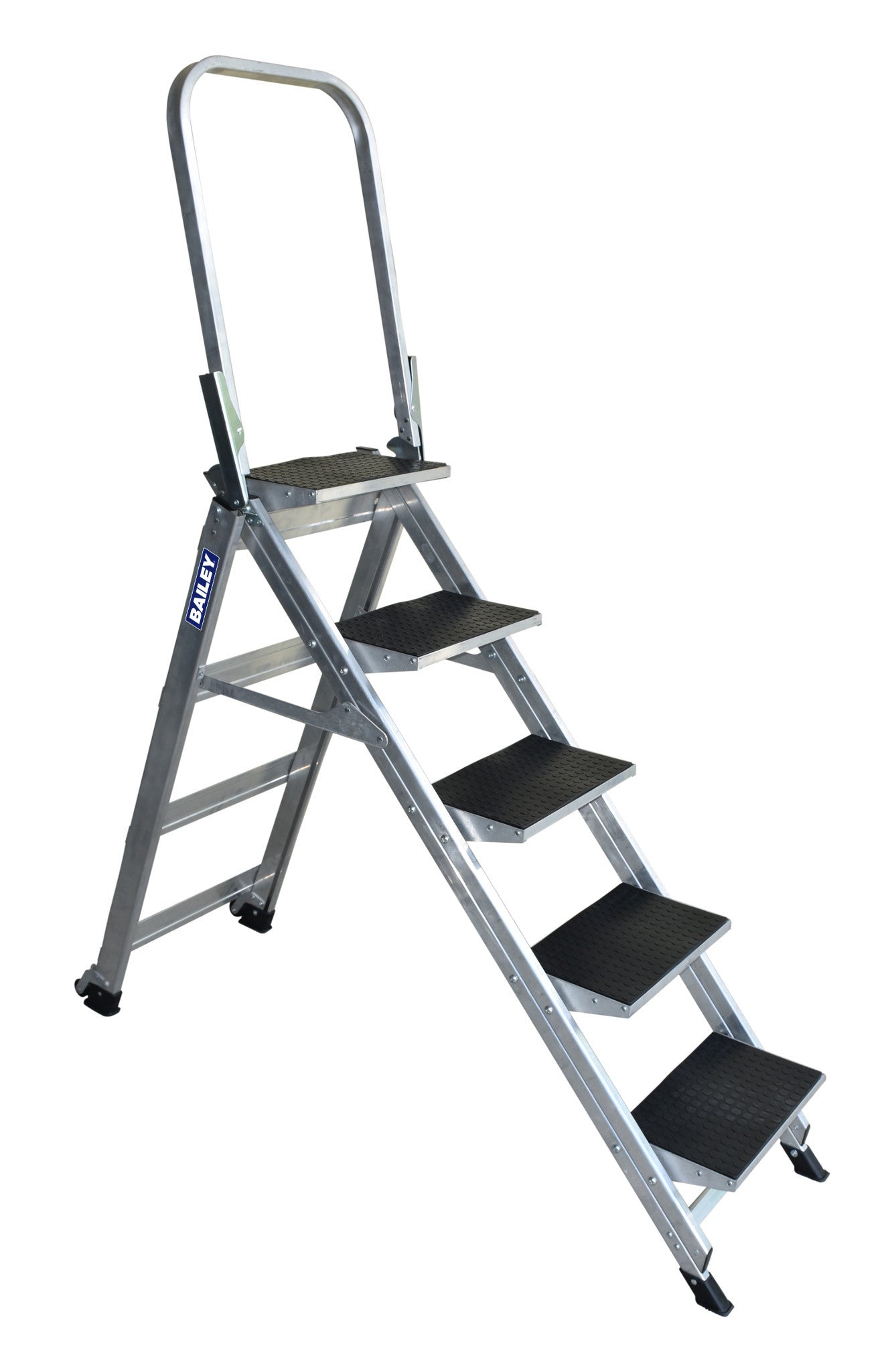 The Bailey FS13753 Aluminium 5-step Stairway Ladder with folding handrail offers safety, stability and strength in a compact ladder solution. The stairway design allows users to walk up and down the ladder with ease; it folds to a compact profile for easy storage in confined locations. Ideal for industrial maintenance, aircraft maintenance, facility managers, retail managers, offices and transport workshops.