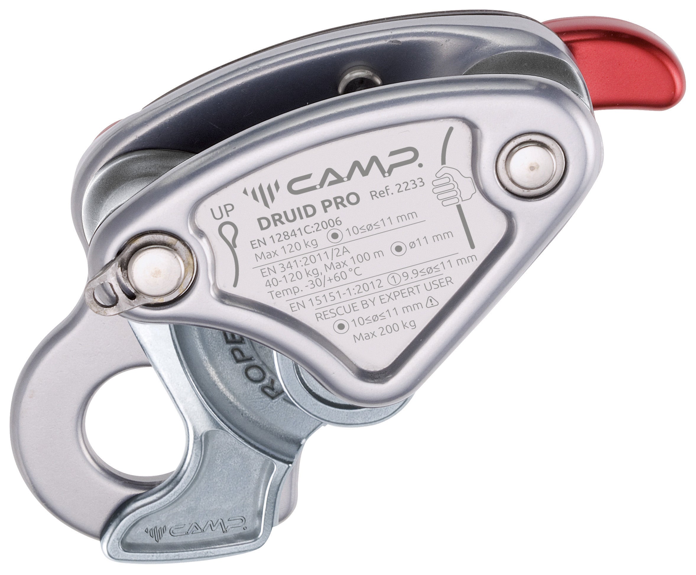 A lightweight, compact auto-braking descender for rope access and rescue designed for semi-static ropes ranging from 10-11 mm. Designed for expert users; the lever does not have the anti-panic function. The body and lever are made of robust hot-forged aluminum alloy. Mechanical parts are made of precision-cast stainless steel. The internal mechanism and locking CAMP use a innovative design for smooth action on the rope which prevents rapid wear-and-tear and absorbs energy from small shocks with a slight amount of rope slippage. The fluid action on the rope also allows the Druid to function well for rope ascent. The CAMP can be de-activated with a trigger to allow quick sliding of the rope in situations with no load or limited load. Steel ring for attaching a keeper cord.