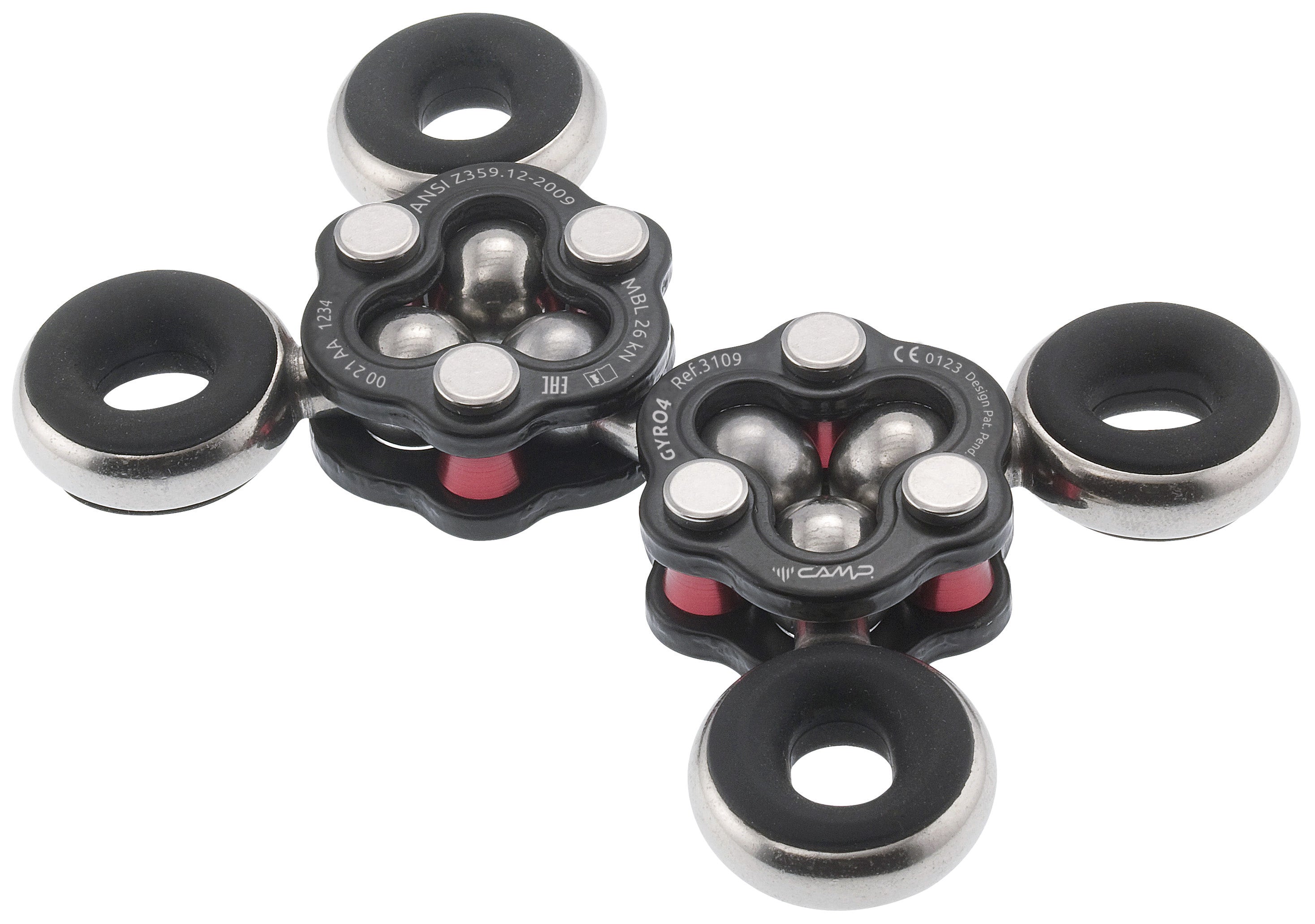 A revolutionary 3D swiveling rigging plate equipped with 4 connection points that rotate independently to allow them to be self-orienting even in the most complex rigging scenarios.