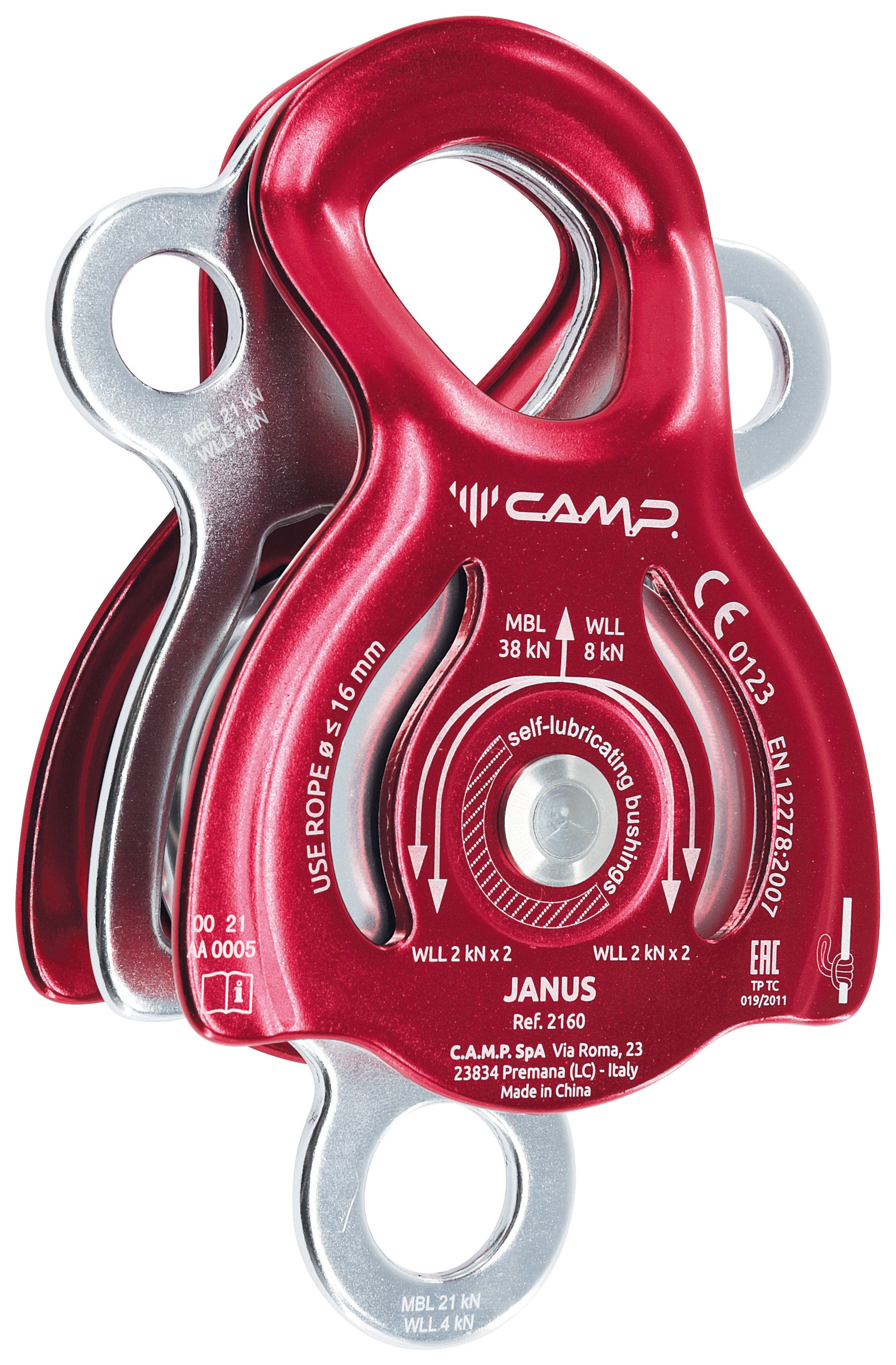 A high strength multifunctional double pulley for block-and-tackle systems and complex operations. Features large wheels, a main attachment point that accommodates three carabiners, and a large becket with a large bottom attachment point and two secondary attachment points on the sides for linking, positioning and attaching progress capture systems. For use with ropes up to 16 mm. Prusik minding, the self-locking knot can be installed on both sides of both wheels. Self-lubricated bushings are sufficient for light applications at low speed. Efficiency: 90%. Aluminum alloy body and wheels, stainless steel axle.