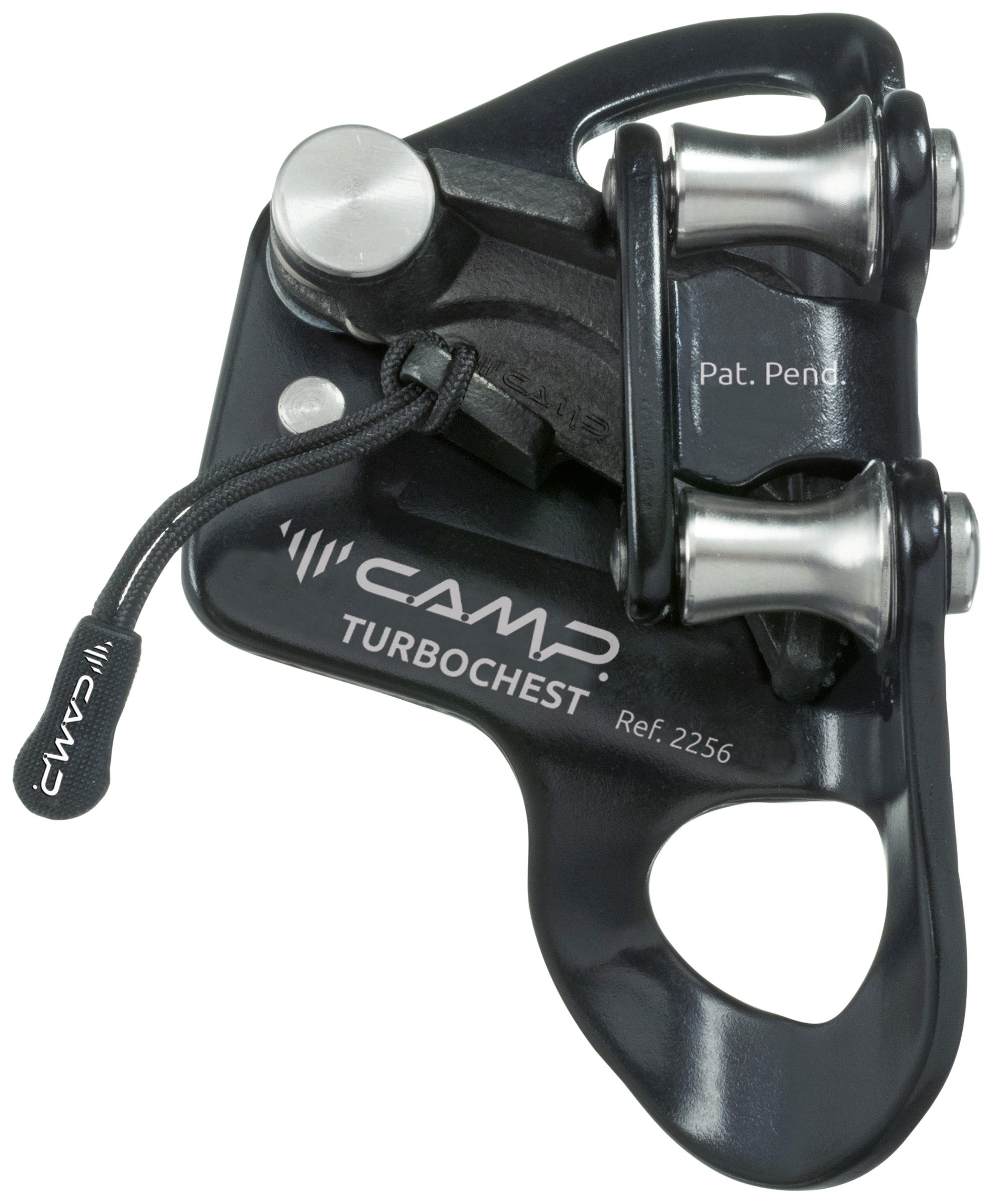 A revolutionary chest ascender that features two rollers for a smooth interface with the rope. This not only helps with climbing efficiency by making the upward glide much smoother. It also reduces dangerous wear and tear on the device where the rope tends to rub on the body of a traditional ascender. The perfectly profiled closure keeps the rope in line with the body of the device and the rollers to prevent the rope from escaping the device during tight pendulums and traverses. Self-cleaning holes on both the body and the CAMP help prevent the build up of grit and grime. Thicker body plates and a shaped connection point reduce wear on the device caused by shifting between the device and the connector (especially when used with steel connectors). This also keeps the device more in line with the body during use. The opening mechanism is simple and secure with the ability to lock the device open for easier attachment and a removable pull cord that makes it easier to operate while wearing gloves. The proprietary rollers also allow the Turbochest to be rigged as a locking pulley for light hauling with a max load of 50 kg, 110 lbs. NOTE: This configuration is not intended for hauling or securing of bodies.