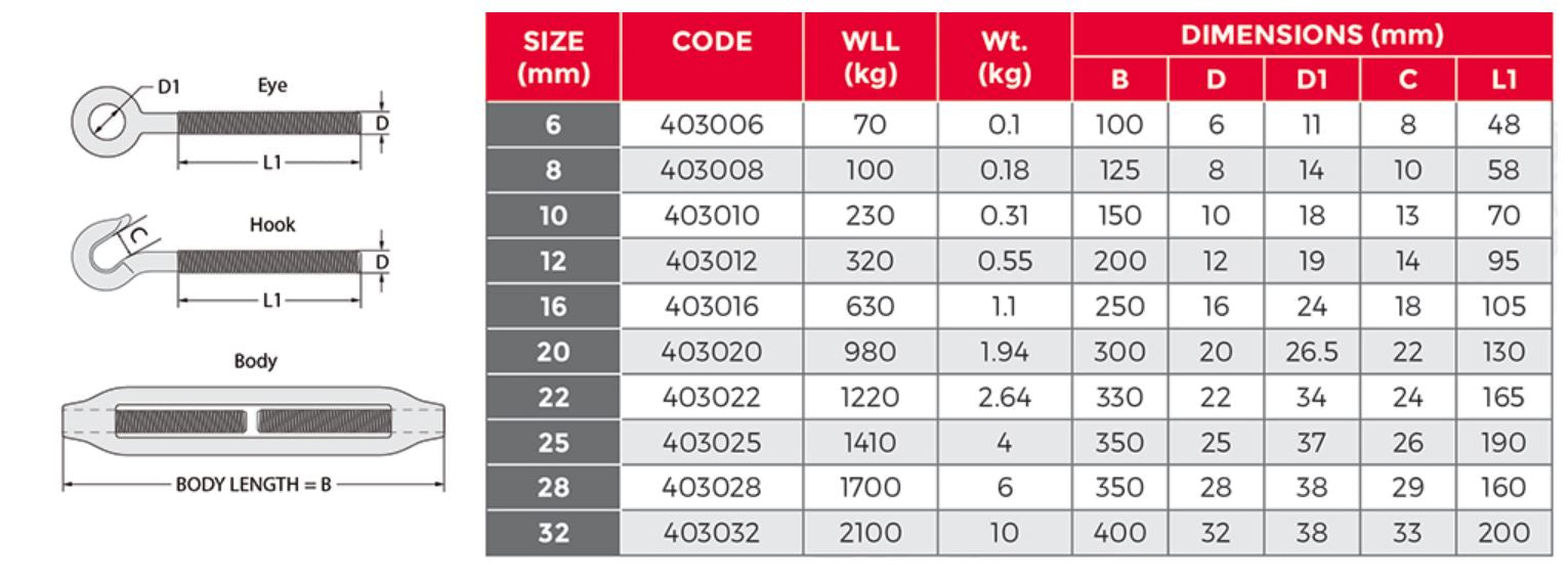 • Suitable for outdoor use in conjunction with wire rope assemblies etc. for heavy duty tensioning applications.• Manufactured from forged steel in hot dipped galvanized finish.
