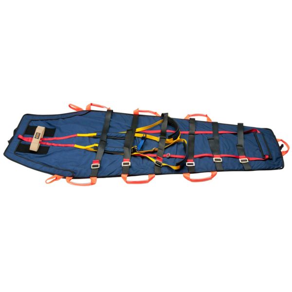 The stretcher is constructed using an inner layer made from a tough high density polyethylene sheet, which give the stretcher it’s rigidity when curved around the patient. The outer fabric shell is made using two different materials. The base fabric is a 1350 Denier Cordura nylon with a heavy PU coating, which has been specially woven to be as tough as possible to resist abrasion and cuts. The top layer is 1000 Denier Cordura making a tough but comfortable layer for the patient to lay on. The carry handles and vertical lift attachment points are construct from 2” web and are designed as structural attachment points for a lifting bridle. The plastic tubing on the carry handle makes for a much more comfortable carry for rescuers. The built-in color-coded full body adjustable harness restrains the patient securely in the stretcher so there is no need to fold over the head and footend of the stretcher, which can cause discomfort to the patient. Padded straps in the shoulder and groin areas make for a comfortable fit, while the foot strap stops the patient from sliding down during vertical lifts. The six outer 2 “web restraint straps further secure the patient into the stretcher by wrapping the stretcher around the patient’s body using a two-bar, thee-bar steel buckle system, which is easy and quick to work with even with glove on. The stretcher comes with a cordura storage bag with backpack shoulder straps.