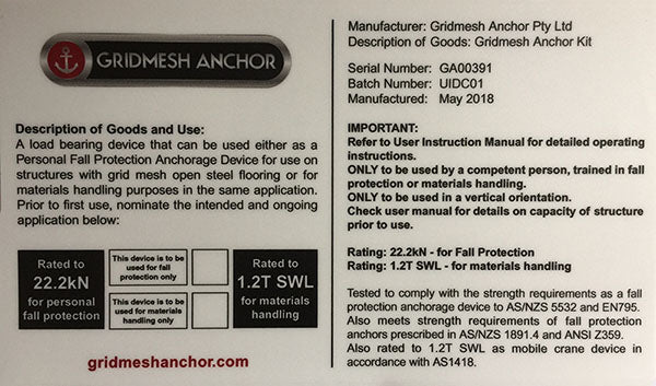 To easily identify the model of Gridmesh Anchor as being for lifting or fall protection, the product label on the inside of the lid is marked with the primary purpose by placing a mark to denote use.