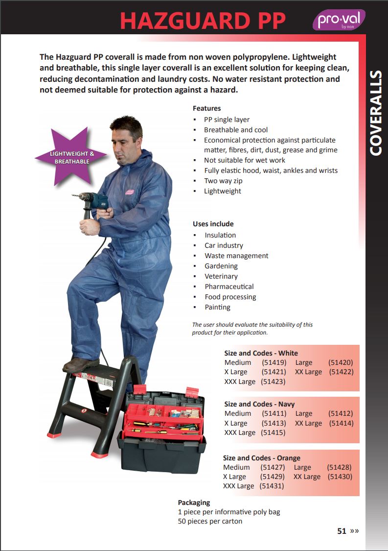 The Hazguard PP coverall is made from non woven polypropylene. Lightweight and breathable, this single layer coverall is an excellent solution for keeping clean, reducing decontamination and laundry costs. No water resistant protection and not deemed suitable for protection against a hazard. ▪ PP single layer ▪ Breathable and cool ▪ Economical protection against particulate matter, fibres, dirt, dust, grease and grime