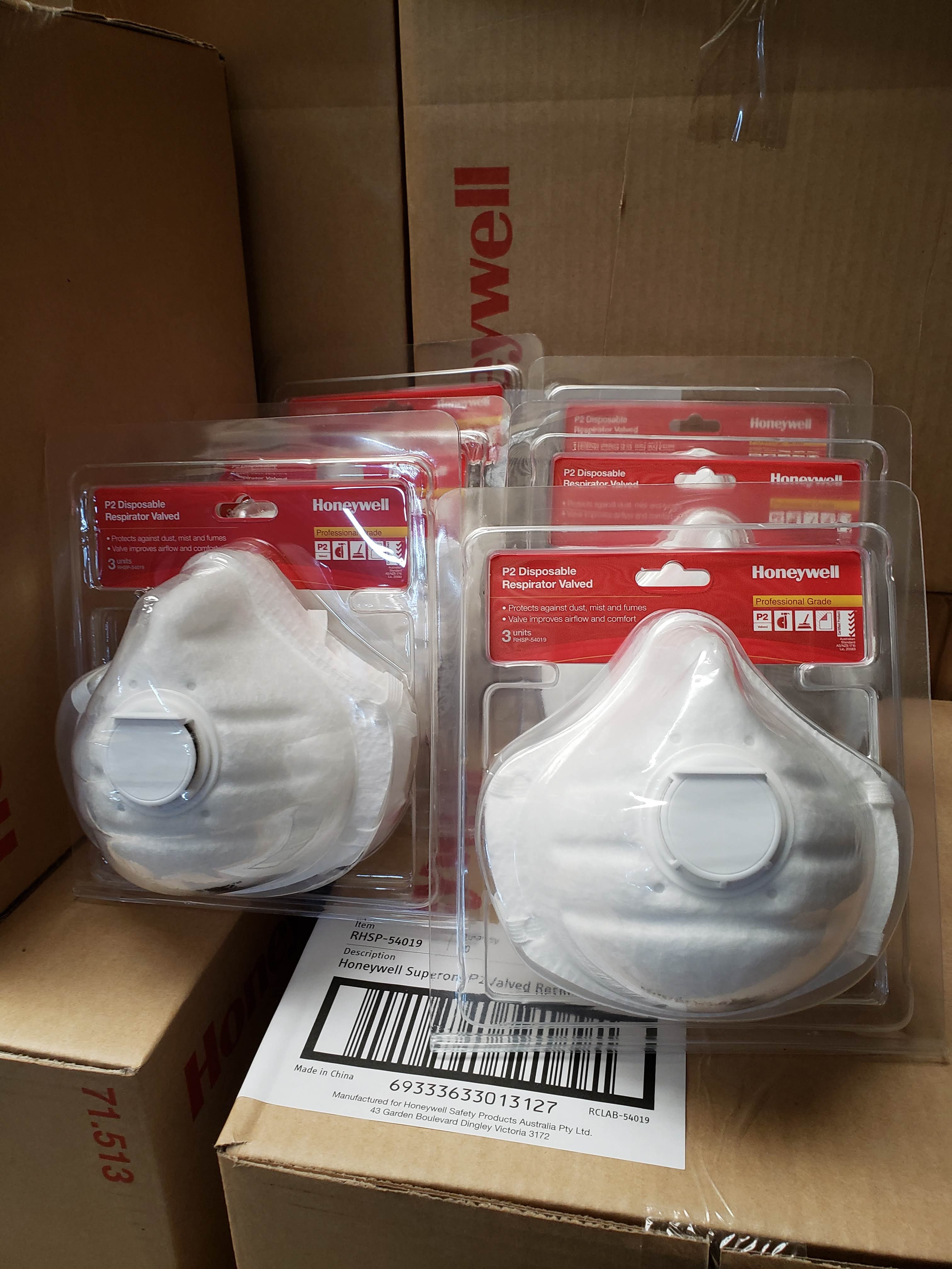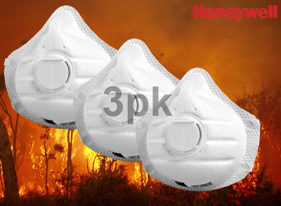 Honeywell Superone W3206 P2 Valved (1015846) Blister pack of 3 respirators. Clamshell Packaging with hang cell and Honeywell Header Card W3206 P2 valved cup shape disposable respirator. Valve provides increased comfort in...