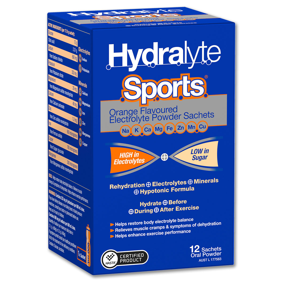 Hydralyte Sports Electrolyte Powder help restore body electrolytes, relieves muscle cramps & symptoms of dehydration and helps enhance exercise performance. High in electrolytes and low in sugar.