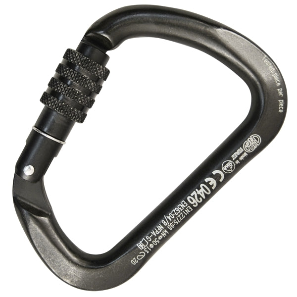 Carbon steel carabiner with screw sleeve. The X-Large is designed to offer a wide gate opening and a high tensile strength. The particular D shape prevents the rotation of the carabiner and allows to distribute the load along the major axis.Equipped with Keylock system that prevents any snagging on the rope and in the bolts.Fitted with screw sleeve, easy to open even wearing gloves.Special burnished finishing that allows a greater visibility of the laser marking.High quality product completely developed and produced in Italy.Tested piece by piece.
