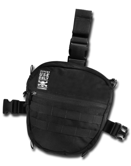 The new Aztek Leg Bag utilizes two stacked compartments to house the AZTEK pulley kit. The mechanical advantage pulley set is accessed from the top pouch, while the edge restraint is deployed from the bottom. The top loop attaches to the harness while the bag rests conveniently on the upper thigh. Adjustable straps with elastic elements attach comfortably around the leg. Features a large zippered accessory pocket and two rows of MOLLE strap to accommodate the attachment of other components.