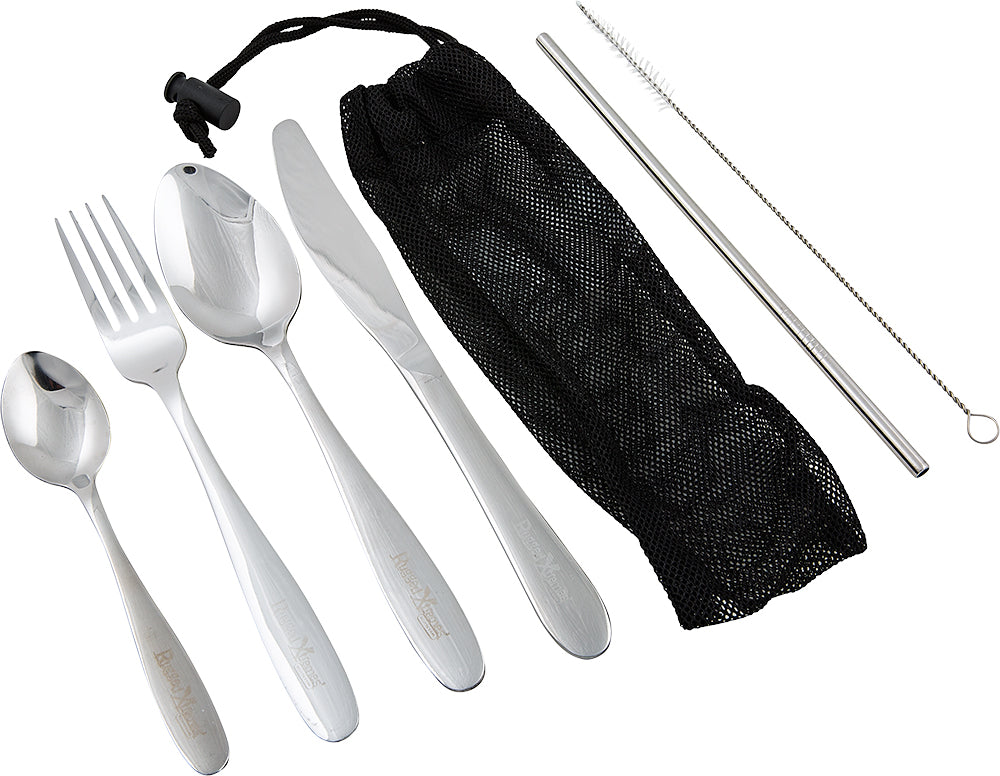 Set Contents: Knife, fork, spoon, teaspoon, stainless straw, cleaning brush