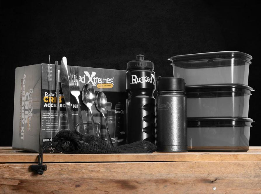Overview Unlock the full potential of your on-site efficiency with the Rugged Xtremes Reusable Crib Accessory Kit. This comprehensive kit is designed for professionals who demand durability, organisation, and ease of access to their gear. With a focus on practicality and resilience, it sets a new standard in keeping your essentials managed and protected, making it an essential asset for any field operation. Durability Meets Design Embark on your day with confidence, knowing every piece of your kit is secure and within reach. The Rugged Xtremes Reusable Crib is a functional design, crafted to support the rigours of industrial environments. Key features include: Highly Durable Materials: Constructed with heavy-duty fabrics, the kit withstands the toughest conditions, ensuring your essentials are safeguarded against wear and tear. Efficient Organisation: Multiple compartments and pockets offer a place for every tool and accessory, allowing for quick and easy access. Ease of Transport: Designed with the professional on the move in mind, this kit features sturdy handles and straps for comfortable transport to and from the worksite. Convenience for Professionals on the Go Designed with the demands of fieldwork in mind, the Rugged Xtremes Reusable Crib Kit provides convenience, making it a favourite among professionals across industries. Versatile Storage Options: Whether it's tools, documents, or personal items, the kit's varied storage compartments ensure everything has its place. Built for the Environment: With materials selected for their resilience to the elements, this kit stands up to dust, water, and the sun, protecting your gear no matter where the job takes you. User-Friendly Design: Features such as easy-grip zippers and adjustable straps. Tailored for Diverse Work Environments The Rugged Xtremes Reusable Crib Accessory Kit shines in its adaptability, proving its worth across a broad spectrum of professional settings. From construction sites to outdoor explorations, it ensures your essentials are organised and accessible. Construction and Mining: Sturdy enough to handle the dust and debris of a construction site, offering convenient access to tools and documents. Emergency Services: Quick and easy access to critical tools and equipment, enhancing efficiency in high-pressure situations. Outdoor Work: Protection against the elements for all your gear, whether you're working in the bush or on outdoor projects. Specifications and Certifications 650mL water bottle with extra-large opening for ice 350mL double-walled stainless steel vacuum insulated thermal mug (keeps hot or cold for hours) 6-piece heavy-duty stainless steel cutlery set (includes a full-size knife, fork, spoon, teaspoon, stainless steel straw, and a cleaning brush in a mesh carry bag) 3x Rugged Xtremes 1100mL reusable crib containers with silicone seals and top-sealing button (vacuum sealed, leakproof, microwave safe, food-safe, dishwasher safe, freezer safe, with a transparent lid for easy contents identification) All products are designed to fit any Rugged Xtremes non-insulated crib bag Your Essential Partner in the Field The Rugged Xtremes Reusable Crib Accessory Kit is not just a tool; it's a partner in the field, designed with the needs of hardworking professionals in mind. It brings together durability, functionality, and convenience, ensuring that no matter the job, your gear is ready and accessible. Ideal for anyone requiring a reliable solution for transporting and protecting their essentials in various work environments, this kit supports your daily grind, enhancing productivity and efficiency.