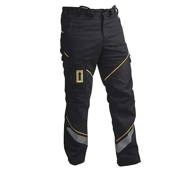 Color:black + yellow and reflexive stripsSize:S, M, L, XLMaterial:98% cotton/2% elastan (250 g/m) + Cordura 500D